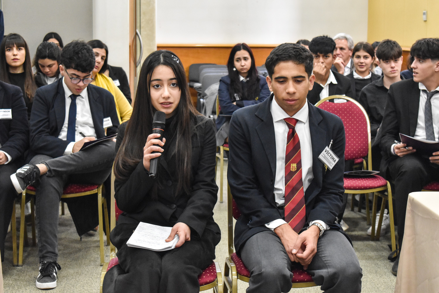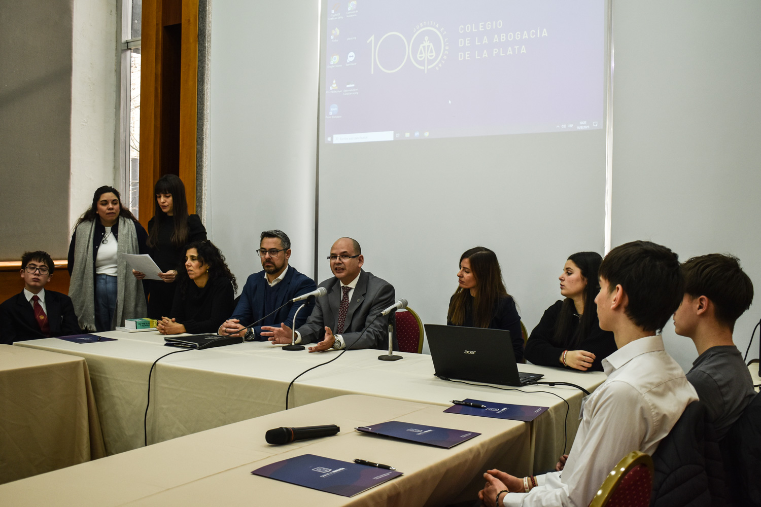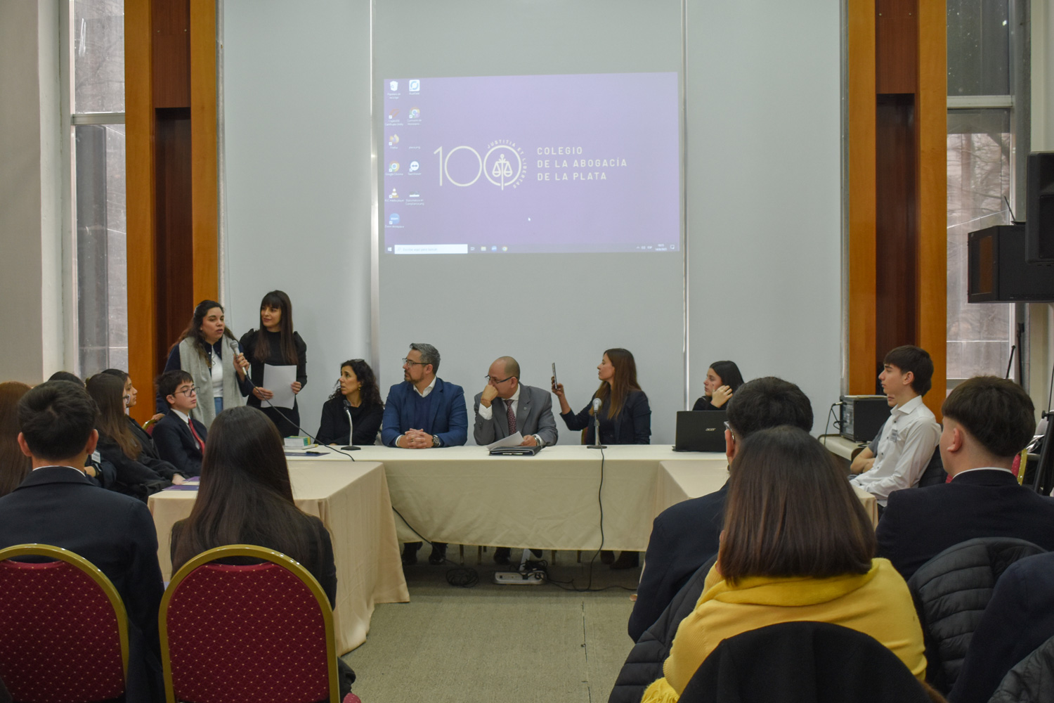 La segunda jornada, en la que se llevó adelante el simulacro del juicio, se realizó en el Salón de Actos del Colegio de Abogados de nuestra ciudad. Los estudiantes estuvieron acompañados por la vicedirectora del CNLP, Ana María García Munitis y por el rector del Colegio Monserrat de Córdoba, Aldo Guerra. Además participaron la jueza Dra. Cecilia Valeros, la secretaría Dra. Guillermina de Lucca y la auxiliar letrada, Dra. Fernanda Neill, pertenecientes al Juzgado Civil y Comercial n° 1 de La Plata.